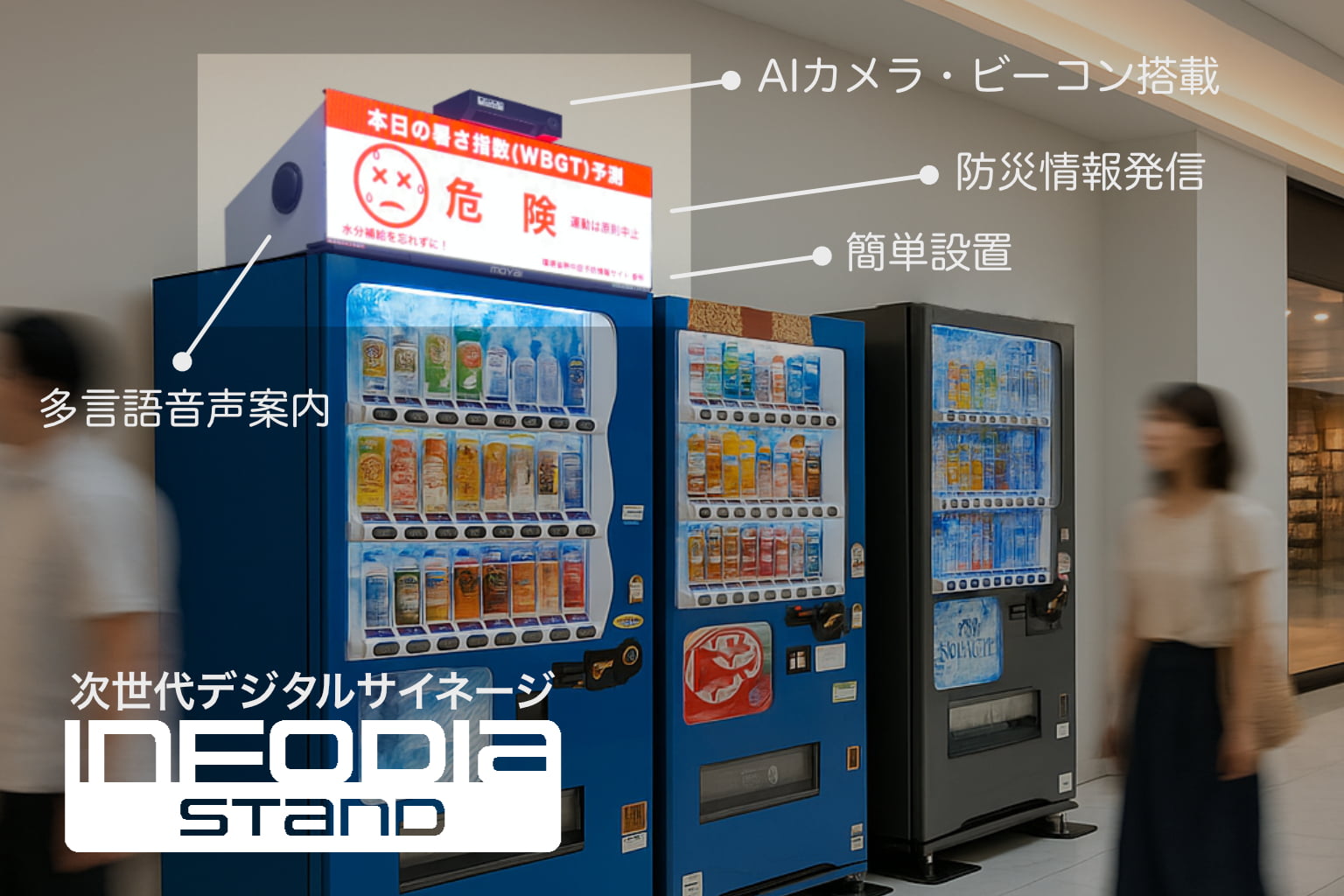 「INFODIA STAND」(インフォディアスタンド」は、自動販売機上部のデッドスペースを活用し、新たな情報インフラを創出する次世代デジタルサイネージです。広告だけでなく、地域情報や防災案内、増加するインバウンド旅行客への多言語発信など、公共性の高い情報も提供します。