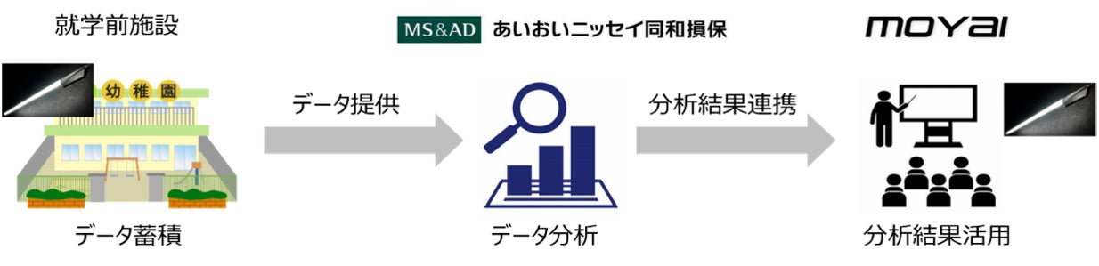 MOYAIの「IoTube」を就学前施設に設置し、そこから得られる映像・音声データ等をあいおいニッセイ同和損保が分析します。そのデータ分析をもとに、MOYAIが就学前施設内での異常事態検知や、リアルタイム監視による現場状況の可視化、関係者へのアラート送信などへの活用を検討し、園児の不慮の事故発生を未然に防止する環境・体制づくりを行います。